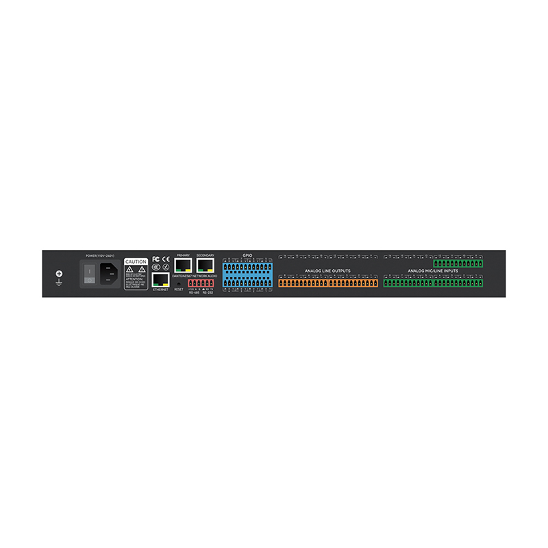 • 输入通道支持增益、幻相供电、信号发生器、自适应回声消除 (AEC)、噪声抑制(ANS)、自动混音,此外每通道还可在16种模块化功能里任意选择5种,包含扩展器,压缩器,5、8、12段PEQ,自动增益,8、12、16段自动反馈抑制(AFC),闪避器,噪声门,噪声增益补偿(ANC),10、15、31段GEQ,延时器等可选;